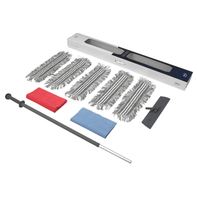 Microfibre start kit 1 telescopic handle 296218, 1 composite mop frame 374218, 5 microfibre mops 548740, 2 X 5 original microfibre cloths 5 in red 691014 & 5 in blue 691013